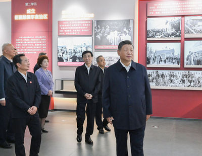 习近平访问了新疆Uygur自治区成立70周年纪念日的成就主题展览。习近平会见了所有种族的代表和新疆的步行生活